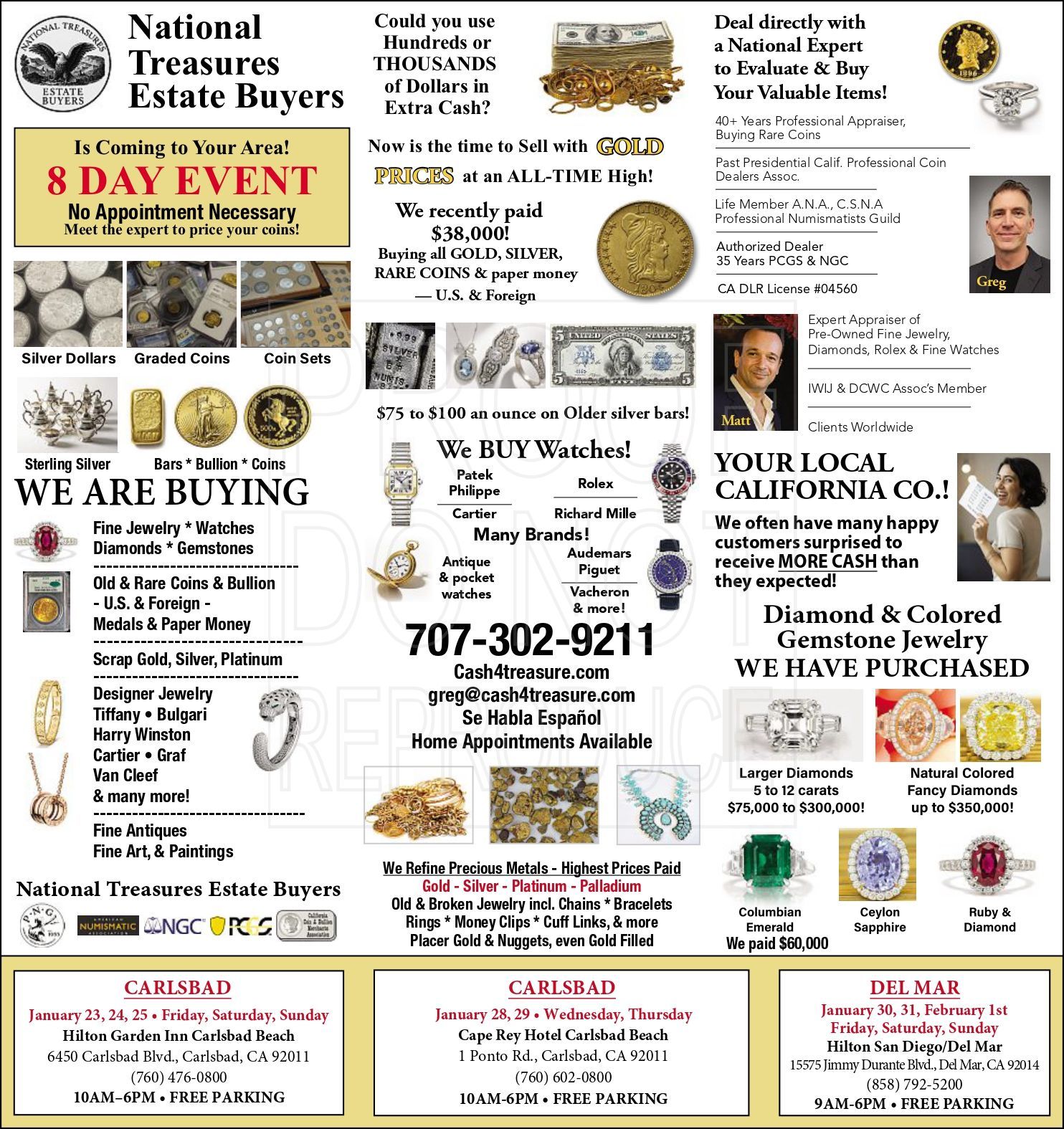 Stay tuned for new event announcements. Whether you have gold, jewelry, coins, collectibles, or antiques, our events make it easy to get accurate appraisals and competitive cash offers without the wait. Call us at (707) 302-9211 to learn more.